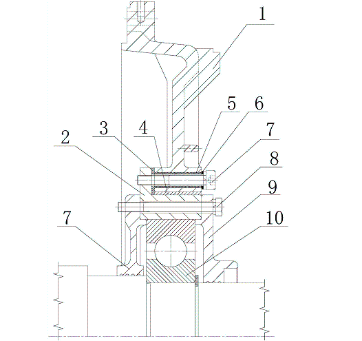 本技術涉及變頻電機,特別涉及一種YVP變頻電機軸承防電腐蝕結構,該結構適用于大功率的變頻電機。 背景技術: 本實用公開了一種大功率變頻電機絕緣軸承套,其通過在軸承的周圍設置絕緣材料來阻隔電流。但是,該技術仍然存在以下幾點不足: (1)內外軸承蓋以及軸承座均 需重新設計,與變頻電機的原系列產品不能通用,產品升級需要的投 入較大; (2)絕緣材料需要通過膠粘的方式和在金屬件上加工鴿尾槽 的方式與金屬件結合,制作十分不便,不利于控制成本。 技術實現(xiàn)要素: 本技術的目的在于,提供一種變頻電機軸承防電腐蝕結構。本設計不僅實現(xiàn)了阻止零序電流經過軸承的目的,且具有實施成本低的優(yōu) 勢,有利于在產業(yè)上推廣應用。 與現(xiàn)有技術相比,本技術的變頻電機軸承防電腐蝕結構能有效阻 止零序電流經過軸承,避免軸承被電腐蝕,保證變頻電機正常運行,從而提高了變頻電機的可靠性,試驗表明,本技術的變頻電機軸承防 電腐蝕結構應用到功率為37kW~1600kW的中大型變頻電機時,電 機軸承不存在電腐蝕現(xiàn)象;此外,與現(xiàn)有技術相比,本技術的變頻電 機軸承防電腐蝕結構還具有以下幾點優(yōu)勢:(1)本技術中的前、后軸 承蓋的結構和尺寸可以與原系列保持相同,具有變頻電機的零件通用 性,不需要重新設計,使得產品升級的投入較低;(2)本技術中,絕 緣材料不需要通過膠粘的方式與金屬件結合,也不需要通過在金屬零 件上另外加工鴿尾槽與金屬件結合,結構簡單,制作方便,有利于控 制成本。 作為優(yōu)化,前述的變頻電機軸承防電腐蝕結構中,所述環(huán)體部位 于所述套體部的內側端部。環(huán)體部位于所述套體部的內側端部時,軸 承套易于制造,有利于控制成本。 作為優(yōu)化,前述的變頻電機軸承防電腐蝕結構中,所述第一絕緣 管的一端與所述絕緣板接觸,另一端與所述套體部的外側端面齊平。 該結構特征可以防止電機端蓋和軸承套因緊固件松動而發(fā)生直接接 觸的情況,進一步提高了絕緣性能,從而使變頻電機的正常運行得到 了進一步保證。 作為優(yōu)化,前述的變頻電機軸承防電腐蝕結構中,所述第二絕緣 管的一端與所述絕緣板接觸,另一端與絕緣墊圈接觸。該結構特征可 以防止電機端蓋和第二緊固螺栓因松動發(fā)生直接接觸,同樣起到進一 步提高了絕緣性能的作用,從而使變頻電機的正常運行得到了更進一 步保證。 為控制成本,作為優(yōu)化,前變頻電機軸承防電腐蝕結構中,所述 的絕緣板、第一絕緣管、第二絕緣管以及絕緣墊圈均為環(huán)氧布材料制 品。進一步,所述絕緣板的厚度為2.5~3.5mm;所述第一絕緣管的 管壁厚度為2.5~3.5mm;所述第二絕緣管的管壁厚度為1.5~ 2.5mm;所述絕緣墊圈的厚度為1.5~2.5mm;試驗表明,絕緣部件 采用上述厚度時,絕緣性能具有保障,成本也較低。更進一步,作為 產業(yè)化生產的一個具體方案,所述絕緣板的厚度為3mm;所述第一 絕緣管的管壁厚度為3mm;所述第二絕緣管的管壁厚度為2mm;所 述絕緣墊圈的厚度為2mm 附圖說明 具體實施方式 下面結合附圖和具體實施方式(實施例)對本技術作進一步的說明,但并不作為對本技術限制的依據。 參見圖1和圖2,本技術的變頻電機軸承防電腐蝕結構包括套設 在軸承10外圈上的軸承套2,軸承套2由軸向的套體部21和徑向的 環(huán)體部22(環(huán)體部22即圖2中圓圈內的部分)構成;所述軸承套2 的套體部21與分別設置在所述軸承10兩側的軸承內端蓋11和軸承 外端蓋9通過第一緊固螺栓8聯(lián)接;所述軸承套2的環(huán)體部22與電 機端蓋1通過第二緊固螺栓7聯(lián)接;所述套體部21與所述電機端蓋 1之間設有第一絕緣管4;所述環(huán)體部22與所述電機端蓋1之間設有 絕緣板3;所述第二緊固螺栓7的螺桿和所述電機端蓋1之間設有第 二絕緣管5;所述第二緊固螺栓7的頭部和所述電機端蓋1之間還設 有絕緣墊圈6。 本技術中,沿軸承套2徑向設置的絕緣板3和沿軸承套2軸向設 置的絕緣管4以及第二絕緣管5和絕緣墊圈6起到阻止電流從電機端 蓋1流向軸承套2的作用,從而避免軸承10因零序電流經過對地形 成環(huán)流出現(xiàn)電腐蝕的現(xiàn)象。 綜合考慮絕緣性能和制作成本,所述絕緣板3、第一絕緣管4、 第二絕緣管5以及絕緣墊圈6可以采用環(huán)氧布材料制品(可以直接從 市場訂購)。所述絕緣板3的厚度可以為2.5~3.5mm;所述第一絕緣 管4的管壁厚度可以為2.5~3.5mm;所述第二絕緣管5的管壁厚度 為可以1.5~2.5mm;所述絕緣墊圈6的厚度可以為1.5~2.5mm。 技術特征: 包括套設在軸承(10)外圈上的軸承套(2),軸承套(2)由軸向的套體部(21)和徑向的環(huán)體部(22)構成;所述軸承套(2)的套體部(21)與分別設置在所述軸承(10)兩側的軸承內端蓋(11)和軸承外端蓋(9)通過第一緊固螺栓(8)聯(lián)接;所述軸承套(2)的環(huán)體部(22)與電機端蓋(1)通過第二緊固螺栓(7)聯(lián)接; 所述套體部(21)與所述電機端蓋(1)之間設有第一絕緣管(4);所述環(huán)體部(22)與所述電機端蓋(1)之間設有絕緣板(3);所述第二緊固螺栓(7)的螺桿和所述電機端蓋(1)之間設有第二絕緣管(5);所述第二緊固螺栓(7)的頭部和所述電機端蓋(1)之間還設有絕緣墊圈(6)。 2.根據實用要求1所述的變頻電機軸承防電腐蝕結構,其特征在于:所述環(huán)體部(22)位于所述套體部(21)的內側端部。 3.根據實用要求2所述的變頻電機軸承防電腐蝕